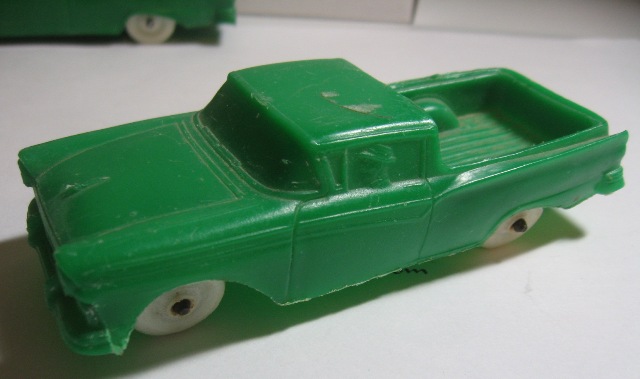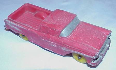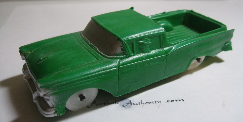 | . | 1/58 | Black & white w red and blue stripes from V on hood down sides. Black bed | #6; white wall tires, stock large hub caps; hood opens reveling red engine, chrome air cleaner; black 3-blade fan. tail gate opens; chrome bumpers; | White interior with white steering wheel