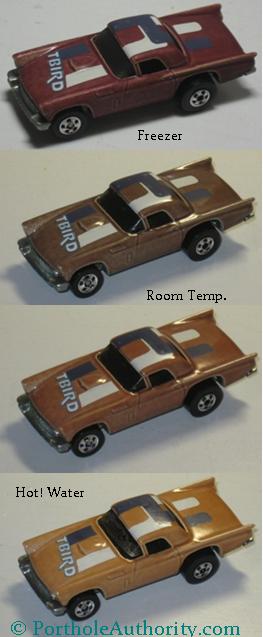 The next time this tampo was used, color change paint was popular. Mattel released the Thunderbird in a 3-pak labeled "Color Racers" in 1988. The model has clear windows, and standard wheels and tires. The package # is 5608-0910-G4. The car was purple that changed to a pinkish orange when exposed to warm water. The stripes are yellow and orange and do not change color. Also, the word "TBIRD" is orange outlined in purple and does not change color. However, the body paint is very light sensitive. Models exposed to light over time become a neon orange and the "orange" stripe almost disappears against this neon backdrop. The ability to change colors also disappears. You'll find plenty of this model on ebay, sold as "pink" or "orange " and few know that it was a color changer at one time. If you should have this model still in its package and it is still purple, then keep it out of ANY light. The following year, 1989, package # 5608-0410-G1 came out with another Thunderbird, again a "Color Racer," again in a 3-pak. This time it has a "triple-change" feature. Originally, the car is purple when cold that changes to blue and then changes to white - the warmer it gets. By 1998, since the paint is light sensitive, it has become a dull purple with white showing through upon extended exposure to light. See above photo for purple color on it. Mine still has some color changing ability - turns almost plum purple when left in the refrigerator and then tan when dipped in hot water. The non- changing stripes are dark purple and white and the "TBIRD" is white outlined in blue. Update