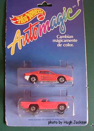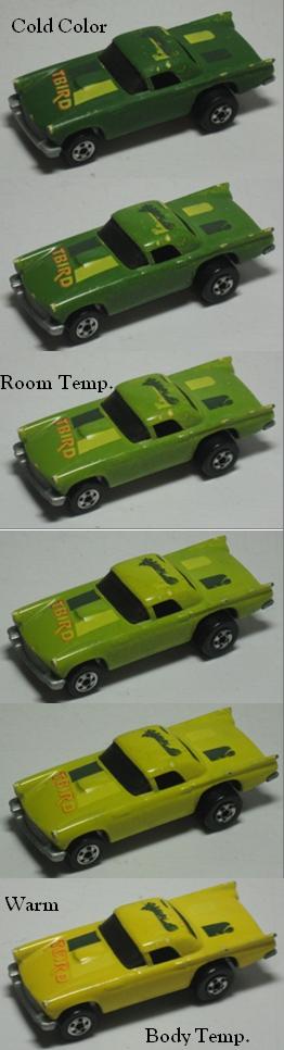 Both of the Color Racer packages were printed in 1987. Both were made in Malaysia. Another color changer has surfaced. From cold to warm, it changes from dark army green to lime green to bright yellow. The stripes are dark blue-green and yellow. The word "t-bird" is yellow outlined in red. Apparently was a foreign issued model. Thought - This model still retains it color changing abilities & the one I picked up is well used. Too bad that Mattel didn't continue using this color paint since it seems to have outlasted the other colors. ![]() ******