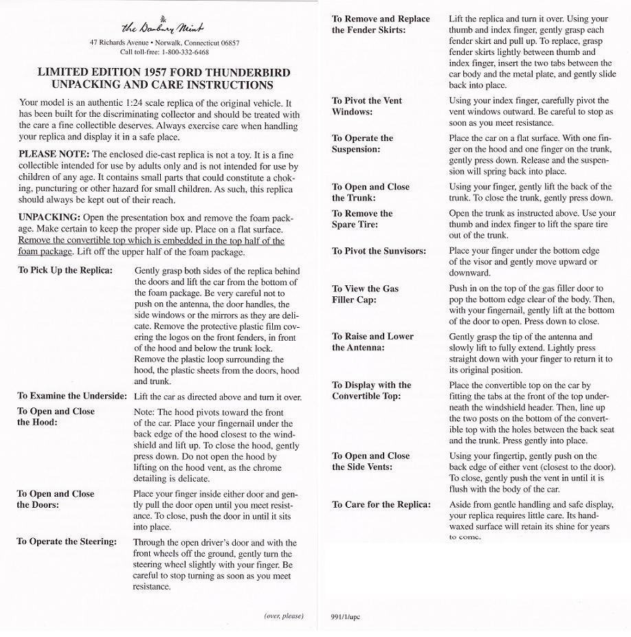 | Danbury Mint | 2007 | Ford Thunderbird | 1/24 | Dusk Rose; black "convertible" soft top that is removeable; Opening hood & trunk; removeable skirts; opening vents & gas flap; active suspension; steering wheel turns; front wheels turn to righr or left; radio antenna moves up and down; detailed engine; Instructions; retail value $140 (edition is now sold out) | |