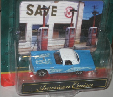 | 2007?/2008? | American Cruiser | 1:64 | Blue with white porthole hardtop, white flame graphics on sides and hood; 8-dot wheels; similar to the Valvoline tbird. Comes with card with photo of gas station. | ||