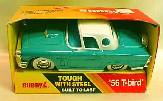 | Buddy L / Macau | 1985 | . | '56 T-Bird #458N | 5" | Red or Peacock Blue tin w/ white plastic porthole hardtop & chassis; chrome bumpers & set-in cont'l kit. 1980 © on chassis; This is the 2nd production phase.\ despite chassis date |