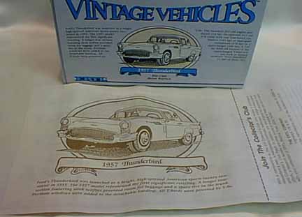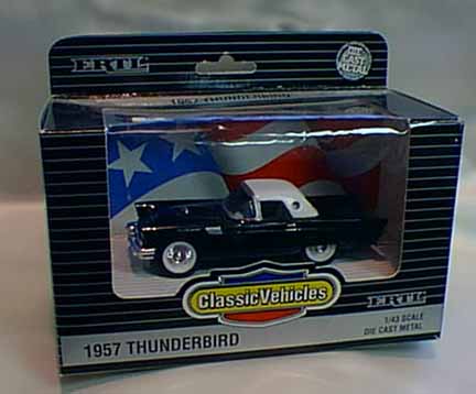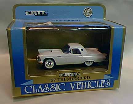 | Ertl / China | 1989 | . | Vintage Vehicles 1957 Ford Thunderbird #2082 | 1:43 | blue w/ white porthole top; nicely detailed; box comes w/57 t-bird print. History of t-bird on back of box;base marked #17 in series of Vintage Vehicles from Ertl |
