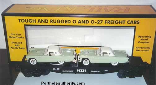 Willow green w/white porthole top - 2 identical cars on flatbed rail car; MY Favorite Color of T-bird!!! Part of series of classic auto transport flat cars. | |
