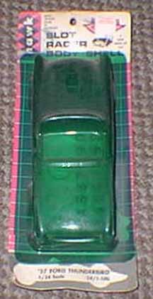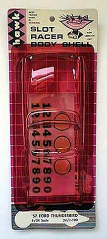 | Hawk Model Co / USA | 1965 | Slot Racer Body Shell | 1:24 | Plastic body shell only; clear, tinted red or tinted green, or yellow; convertible style | |