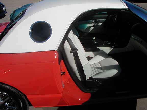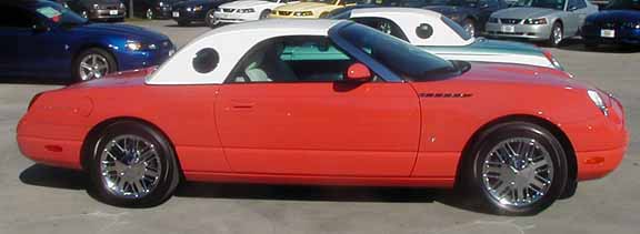 This limited editon features chrome 21-spoke wheels just like the Neiman Marcus editions had for 2002. The seats are a solid "performance white" colored leather. The doors are trimmed with white "wings" and the lower part of the dash is white. There is a "007" badge on the metal trim across the dash above the glove box. The hardtop color is "performance white." The steering wheel and shift knob are covered with "black ink" leather, a departure from the other "full accent" interiors. The transmission has the select shift automatic (an 03 option) and the 3.9L, 280hp engine which is standard for the 2003. Each 007 car has their own special plaque in the glove box, serializd from 001 to 700. MSRP was $43,995 update: This edition is available in Canada. - 60 cars worth plus rumor that there are some for the European market. *Another bit of trivia - The color code CQ is also a Morse Code abbbreviation. I suppose to go along with the spy theme for the car. Interesting that some of the special color codes and body codes for the Thunderbird have alternate meanings. |