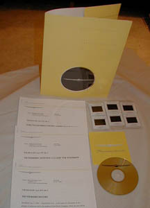 . | Contained a yellow glossy folder with Porthole window viewing a CD with all the press info; 6 slides; 3 press release info booklets; | |