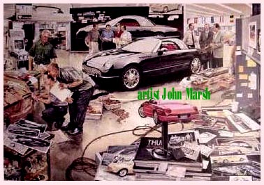 Signed and numbered by artist John Francis Marsh; limited edition print of 2000. Shows design studio and Ford designers working. Press exclusive. Presented in Black cardboard tube with silver Thunderbird emblem at January 2001 Detroit Auto Show. All prints should be signed and numbered. Contact artist if you find one that is NOT signed and numbered. Poster size measurement 26"x34" |