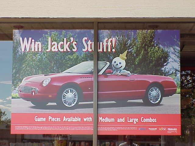 Large window poster for the Jack in the Box fast food chain - 2 parts - Red 2004 T-bird with "Jack" driving. -- tthese poster were "glued" to windows so few if any survive. |