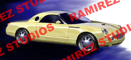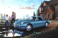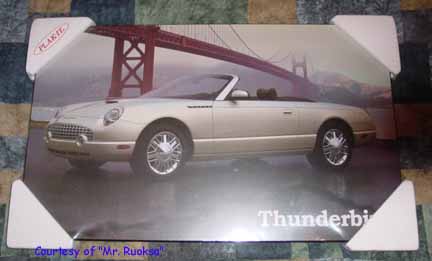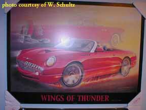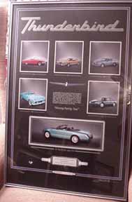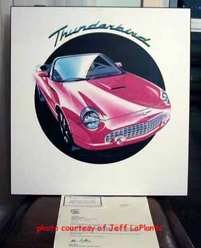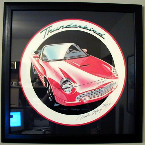 "Ford of Canada did commission these in 2001 to raise money for Breast Cancer research. The framed, numbered, artist prints were available only to the dealer principals at a cost of $500.00 each. The framed print also included the actual Thunderbird hood emblem shadow boxed beneath the print itself." quote from Mike Hall, a Tbird owner. |