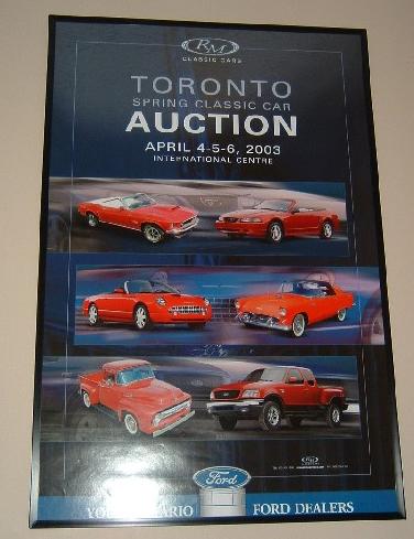 RM Auction poster for April 2003 - red 02 and red 56 with blue 02 background; Ford Mustang and Trucks |