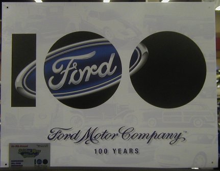 Ford 100th Anniversary sign with light background including new Thunderbird in lower right corner and a 55 Thunderbird |