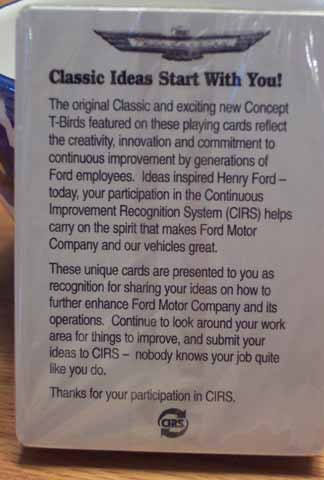 | . | ? | Cards | Double deck of cards given to Ford employees. 0ne deck has view of 55 T-bird, other deck has view of Concept black T-bird. Backside has reason for existence | ||||||||||||