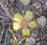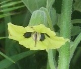 another ground cherry smaller Physalis species, flrs about 1.5cm across, 1cm in length. cream-colored with no dark centers. Calyx encloses seed pod with purple veined ribs. |